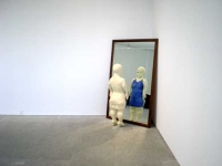 Un segundo eje de la exposición sería la búsqueda del intersticio narrativo, del hueco vacío, del no lugar. Aquí entran en juego dos o tres elementos. En primer lugar, el diálogo que Juan Muñoz establece con algunos clásicos como Velázquez, al presentar figuras enanas (ya sea sobre pedestal o reforzadas en su pequeñez rodeadas de otros elementos), constituye un intersticio temporal, un hueco sin posible relleno. Así, son seres “con diferencia” George (1989/1994), Sara con mesa de billar (1996), El apuntador (1988), o Ventrílocuo mirando un doble interior (1988/2000), muñeco de boca articulada, recurso que utilizaría el artista en otras ocasiones. El segundo intersticio lo llevamos todos dentro y se refleja, nunca mejor dicho, en el uso del espejo en las obras de Muñoz. Aquí se presenta otra vez Sara en Sara frente al espejo (1996), y otras figuras que se buscan más allá de lo posible. El camino corto o largo que recorre una conversación es un intersticio que inunda la obra de Muñoz por completo y que hace que, tanto sus obras más narrativas como las más conceptuales, sean un intersticio en sí mismo. Así las tres Vitrinas cruce de caminos (1991). Así Doble contraventana (1991). Así Primer pasamanos (1987). Así Balcones opuestos (1991). Así Ascensor (1996)…