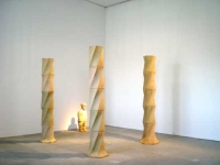 Otro camino, menos evidente, sobre el mismo tema queda reflejado en varias piezas fundamentales dentro de la muestra. Hanging figures (2001), son dos figuras que cuelgan ahorcadas por su lengua. Fue una de sus últimas piezas. Many times (1999), es una pieza constituida por un centenar de esculturas de figura humana que ríen con unos caracteres faciales similares, de corte asiático, pero que presentan posturas distintas entre sí. Un paseo por entre esas figuras hacen verdad el sueño de Juan Muñoz, cuando afirmaba: “Me gustaría que el espectador pudiera entrar en la obra de arte como un actor entra en su propia escena… Me gustaría que quien acude a una exposición, ya sea en un museo o en una galería, se comportara como lo haría un actor, un actor inmóvil”. Chica con cesta (1996), representa una joven cuya cabeza y brazos se encuentran embutidos en una cesta de mimbre.