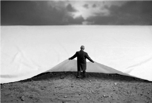 Gilbert Garcin lo cuenta una y mil veces, mas siempre parece la primera: “Realizo apuntes y dibujos de lo que quiero hacer, pero como soy mal dibujante termino preparando una fotografía. Una vez que tengo la idea, creo el escenario, los elementos mínimos. Después, en la terraza de nuestra casa en Marsella, una zona tranquila donde nadie nos ve, nos fotografiamos [Garcin y su mujer, convertida en espejo de su personaje, siguiendo una regla no escrita de sintetizar, economizar al máximo los medios] en la postura que debemos tener. Recorto las siluetas de esas fotografías, sustituyo mi cabeza por la del personaje, y la pego sobre la foto del decorado”. El recorte de las siluetas no es, voluntariamente, perfecto: deja siempre la huella del pulso manual. En sus imágenes, busca quedarse en zonas de confusión, de múltiple sentido, nunca inducir a las lecturas unidireccionales, razón por la que asegura que le sigue dando pudor titular las obras, una práctica a la que accedió por la insistencia (afortunada, a tenor de los resultados) de un marchante.