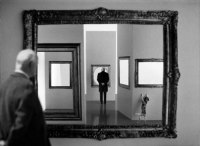 El punto de partida es, por tanto, sencillo, limpio, delator. Garcin reivindica cierta manualidad y un proyecto estético de fácil entrada, capaz de sorprender tanto al que mira casi de soslayo cuanto al que investiga. Sus obras ofrecen en respuesta a la intensidad de quien mira: no son efectistas sino eficaces, no son símbolos cerrados sino fragmentos de un relato abierto, evocaciones de la emoción ante una sorpresa. Pero esa sorpresa no es producto de un encuentro inusual sino de mirar con curiosidad, casi con zozobra, lo cotidiano, lo próximo. Uno de los grandes aciertos de Garcin es su ausencia de retórica, su manera de jugar con los recursos casi primarios de las imágenes. Sus fotografías parecen preguntas al tiempo ingenuas y en extremo sagaces. Que haya elegido la austeridad del blanco y negro juega a su favor: le permite dominar con destreza el medio y sitúa a sus imágenes en la herencia de un cine que relata historias y se basa en un gesto, en una fuga, en un silencio, en un efecto de luz, en una escena que se detiene. Sus imágenes tienen conexión con los mundos de Charlot, de Buster Keaton, de Jacques Tati, de Alfred Hitchcock, pero también con la herencia de los collages surrealistas, o de las enigmáticas fotografías de Magritte. Garcin es un puzzle en el que las piezas encajan perfectamente: se esforzó por dar autonomía a su personaje, por hacerlo realmente intemporal, y su figura paternal y aparentemente despistada refuerza el sentido de su propuesta. Cuando comenta la vida en pareja se percibe el humor, la ternura, la sagacidad; cuando se evoca como artista, salen al tiempo el ego y la insatisfacción de estar siempre frente a una imagen más potente y enigmática: la realidad. Cuando visita el museo, encuentra los motivos en su reflejo, en los rincones, en las fugas, animándonos a mirar, a traspasar la imagen primera; sus comentarios al arte moderno son sagaces como los textos más incrédulos de Ernst Gombrich. Garcin nos lleva a su terreno, y en él se muestra divertido y preciso, silencioso y locuaz. Son sus imágenes las que parecen siempre dispuestas a tomar vida, como si estuvieran más cerca del relato concentrado que de la instantánea. Como si se detuvieran al ser sorprendidas, como si no necesitasen de nosotros para existir.