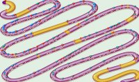 Ilustración del cromosoma de levadura representado en forma de serpiente. Aparecen marcadas las posiciones de los 'cambios de diseño' y los segmentos eliminados más o menos a escala
