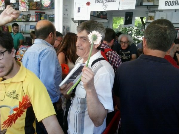 El pasado domingo 7 de junio la feria del libro de Madrid fue testigo de un acto que sirvió para presentar el último poemario de Hipólitio García Fernández, "El charro roto de Jorge Negrete", editado en la colección "Los libros de Ouka Leele" por Huerga y Fierro Editores. Paseando por el Parque del Retiro de Madrid desde la entrada más cercana a la estación de metro de Ibiza, los asistentes, portando cada uno una gerbera en la mano, anduvieron el camino que les separaba de la caseta 308 de la feria, donde Hipólito García "Bolo" se dedicó a firmar libros con rotulador, bolígrafo y brochazos de colores. El acto se dio por finalizado a las 3 de la tarde con el cierre al mediodía de las casetas de la feria. Hasta ese momento Bolo atendió el rosario de amigos, lectores y viandantes que tuvieron a bien pasar por la caseta a saludarlo, comprar el libro (13 euros) y hacerse una foto con él.