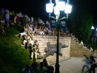 Público en la montaña del Príncipe Pío escuchando el concierto de Ara Malikian que se desarrollaba en la esplanada del Templo de Debod en el Parque del Oeste de Madrid.