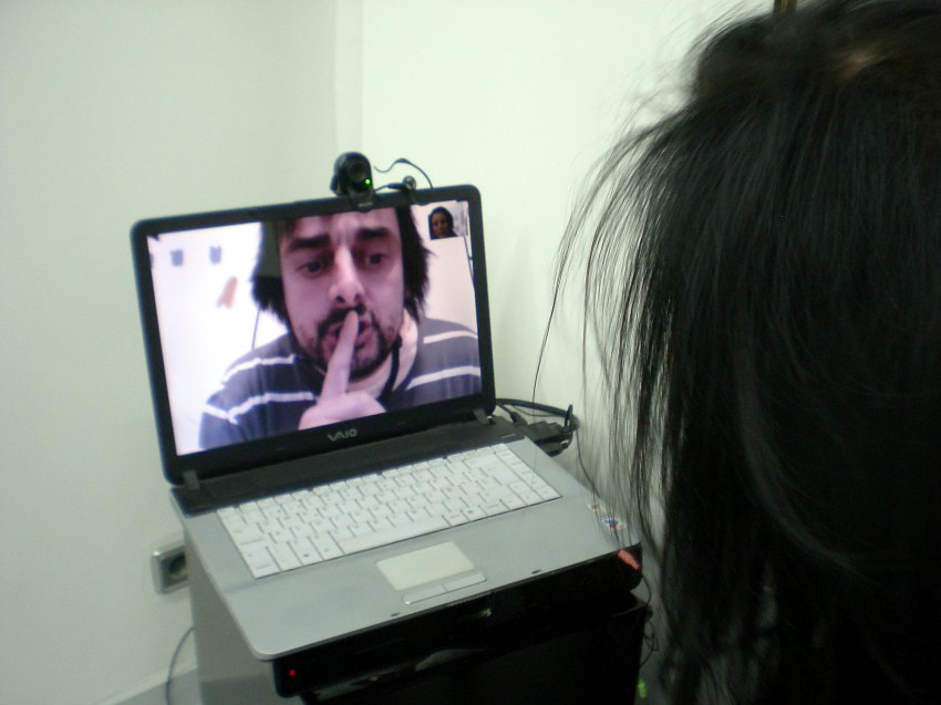 Xavi Carbonell realizando una performance desde Nueva York a través de internet en la galería Catarsis.