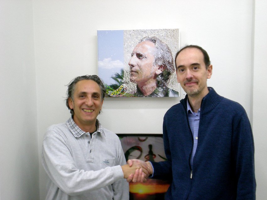 Julian Moreno, a la derecha, delante de su obra titulada "Perejil y Plátano" en la galería Catarsis de Madrid. A la izquierda, el galerista Alfonso González-Calero.