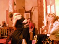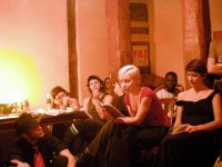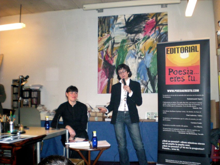 Lectura de poemas de Nuria Ruiz de Viñaspre en el café-bar "El Bandido" de Madrid, durante la presentación del libro "La geometría del vientre". A la izquierda Mayte Sánchez Sempere, editora.