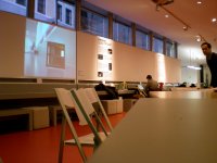 Sala polivalente de Medialab Prado. A la derecha aparece Marcos García.