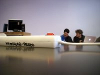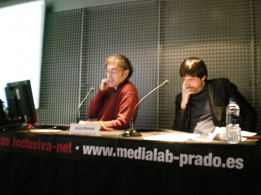 Presentación pública de "Fronteras y territorios en el ciberespacio", desarrollado por el I+D de nexo5. A la izquierda, Chuso Moreno, ponente, y Juan Martín Prada, director del congreso "Inclusiva-net". Sala polivalente de Medialab Prado.