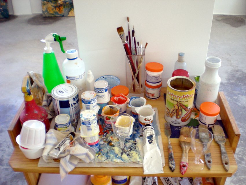 Mesa de trabajo del artista plástico José Agulló en su estudio.